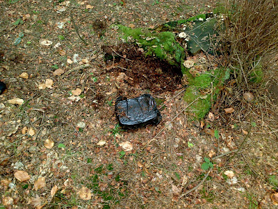 a że już byliśmy w Cierpiszu i to nawet wyjechaliśmy kawałek pod górę, stwierdziliśmy, że zahaczymy o Magdalenkę. Był to olbrzymi błąd ;] Droga MASAKRYCZNA, peeełno błota i w ogóle... tragedia. No ale... jedziemy. Po chwili zobaczyliśmy drogę asfaltową obok nas. Konsultacja z mapą na GPS i.. ok, idziemy. Niestety później źle skręciliśmy przez co praktycznie niosąc rowery i brnąc po kostki w błotku (wszystko rozjeżdżone przez ciężki sprzęt), dotarliśmy prawie do kapliczki (Magdalenka). Miałem tak dobrze zbierającą oponę z przodu, że co chwila stawałem by wyczyścić rower, bo koła się nawet nie chciały kręcić: